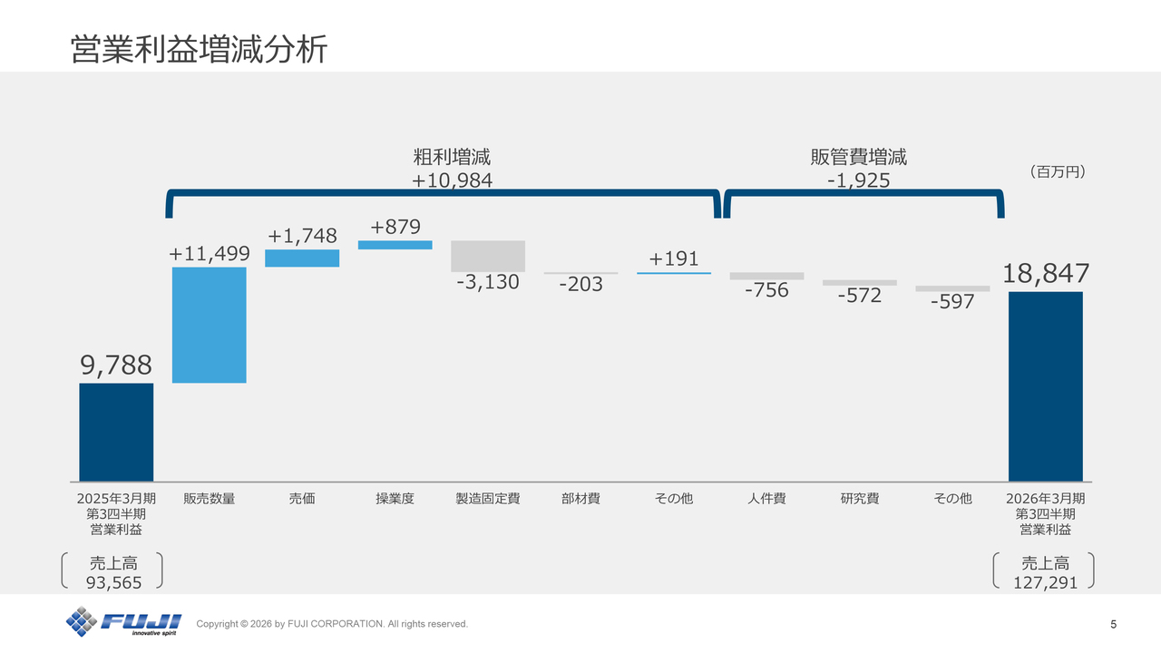 販売数量の増加により114億9,900万円のプラスとなっています。マウンター市場が昨年度より拡大している中で、当社も市場シェアを伸ばし、販売数量を大幅に増加させた結果です。
