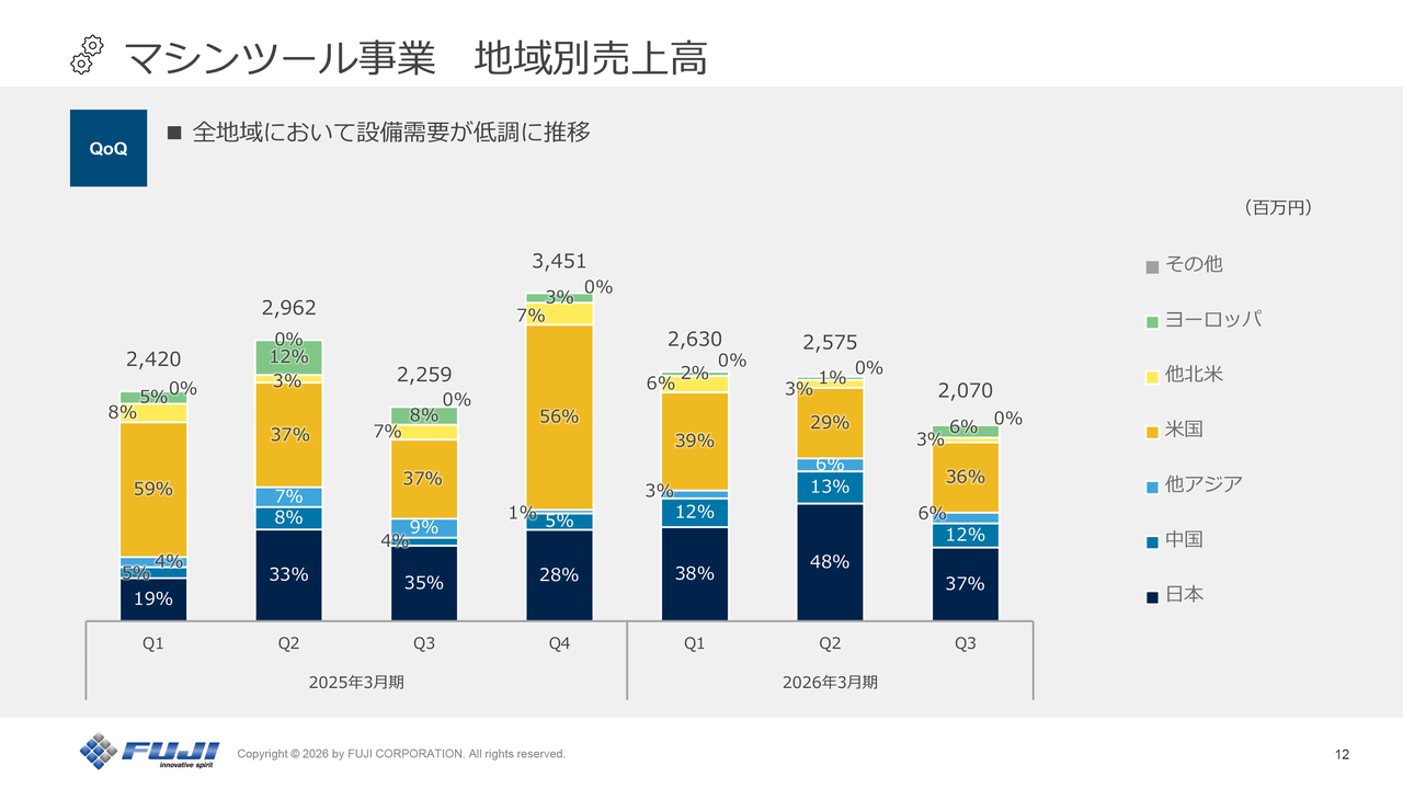 マシンツール事業の地域別売上高です。第2四半期では日本国内向けが若干回復の兆しを見せましたが、顧客の新規設備投資判断には慎重さが見られました。第3四半期は全地域で設備投資需要が低迷する結果となりました。