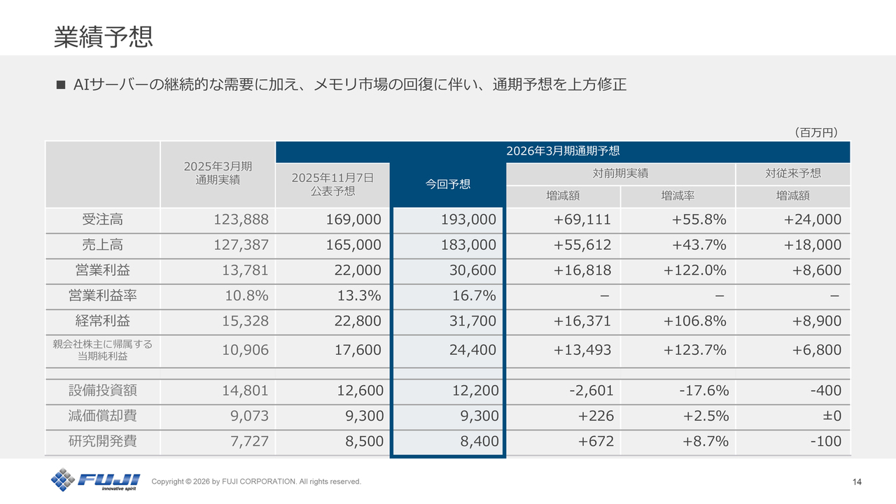 2025年11月7日に公表した連結業績予想値を上方修正します。AIサーバー関連の設備需要が活発に続いていることや、メモリ市場の回復により半導体関連の需要が急回復していることを受け、受注高を240億円、売上高を180億円増額します。