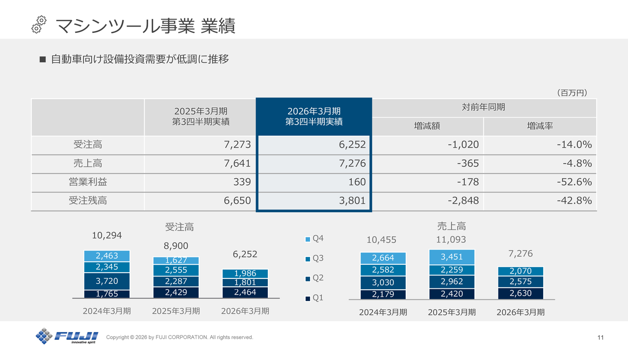 第3四半期には自動車業界向けの仕事が減少している影響が顕著に現れました。しかし、市場全体の規模は縮小しているものの、同業他社のような全方位的な展開ではなく、特定の領域でオンリーワンの立場を取っていく方針です。