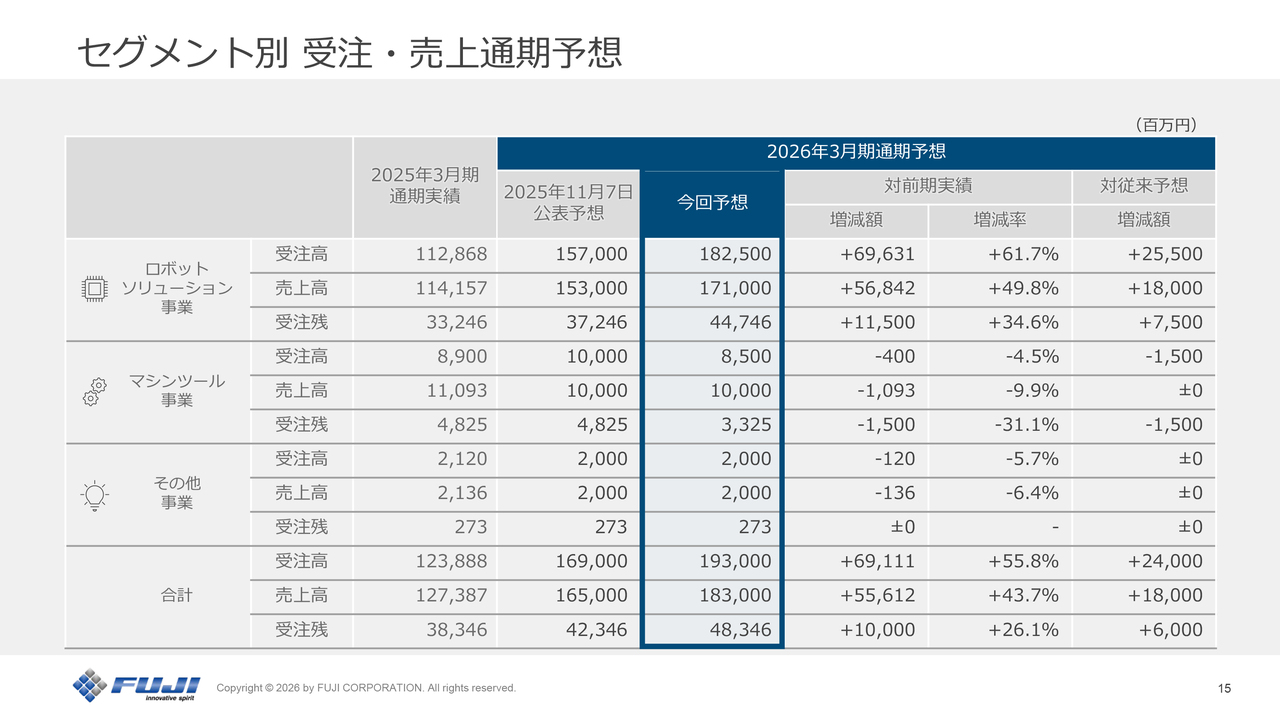 セグメント別の受注・売上内訳はスライドに記載のとおりです。先ほどご説明した業績予想の上方修正は、主にロボットソリューション事業の予想見直しによるものです。