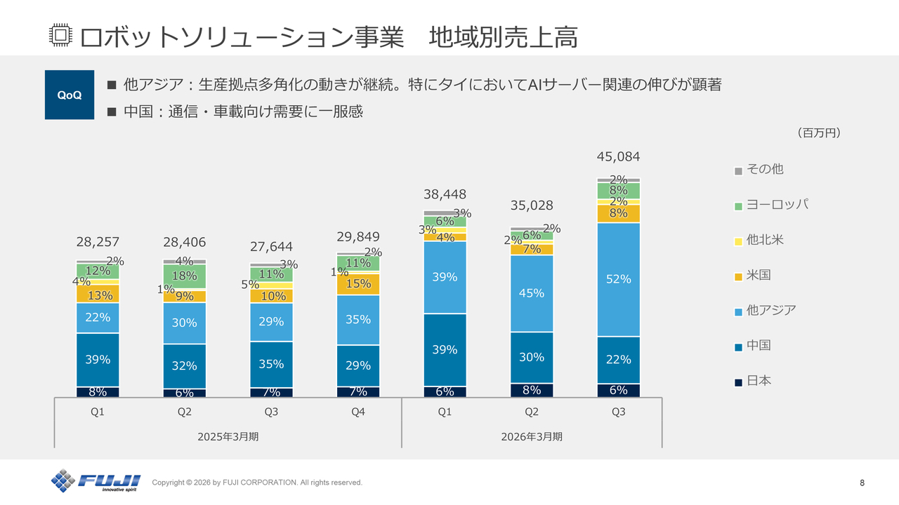 ロボットソリューション事業の地域別売上高です。スライド右側に示した2本のグラフを使用し、第2四半期と第3四半期との比較でご説明します。