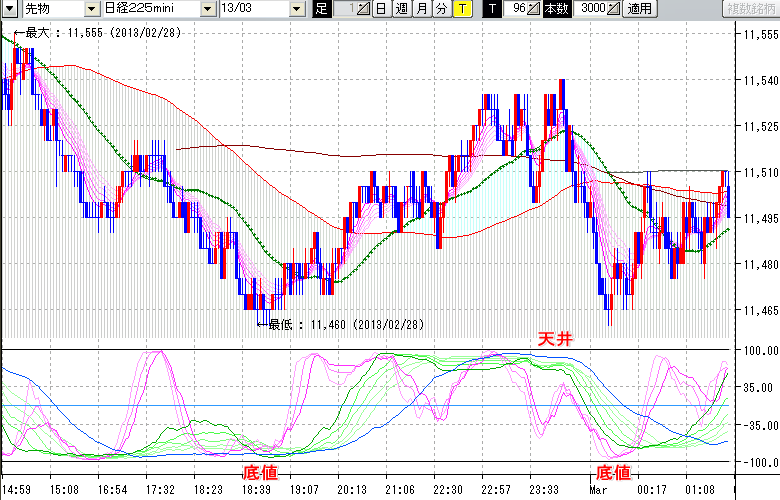 日経平均は ¥11,683.45 (+31.16) 4日続騰 ボリンジャーバンド(25日)は、+1.7 σ 225mini(3月限) 大引け ¥11,650 (+40) 東証一部の25日騰落レシオは 113.22東証一部の出来高は 30.8 億株 相場は上昇。 出来高は連日20億株を超えています。ドル/円は 93円前後。TOPIXは下げでしたので股裂き状態。 -
