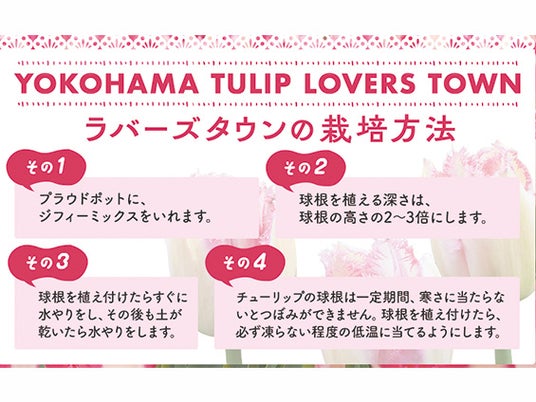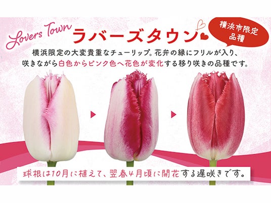 「ラバーズタウン」は、花弁上部にフリルが入り、咲きながら白色からピンク、赤へと変化する移り咲きの品種です。10~11月の植え付け適期に球根を植えると翌年の4月頃に花が咲きます。横浜の街が春先に徐々にピンク色になっていく様子と、恋人たちが頬をピンクに染めながら想いが少しずつ盛り上がっていく様子をイメージして、「ラバーズタウン」と命名されました。
