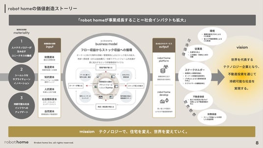 株式会社 robot home(本社:東京都中央区/代表取締役 CEO:古木 大咲/証券コード:1435、以下当社)は、当社と社会との関係性やその責任、ステークホルダーとのつながりについて分析し、持続可能性の観点からレポートにまとめ、この度初めてソーシャルインパクトレポートを公開いたしました。「世界を代表するテクノロジー企業となり、不動産投資を通じて持続可能な社会を実現する」というビジョンのもと、不動産を通じた社会課題の解決を目指す当社の取り組みをご紹介しております。