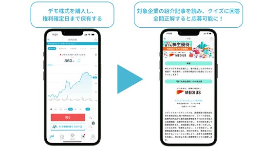 グリーンモンスター株式会社(本社:東京都渋谷区、代表取締役:小川 亮、以下グリーンモンスター)は、体験型投資学習アプリ「株たす」において、デモ株式を購入し条件を満たすと、抽選で実際の株主優待と同等の商品がもらえる「誰デモ株主優待」について、メディアスホールディングス株式会社(本社:東京都千代田区、代表取締役社長:池谷 保彦、以下メディアスホールディングス)によるご協力のもと、第7弾となる企画を開始いたしましたことをお知らせいたします。本企画は「株たす」のユーザーに対し、株主優待制度の魅力を体験しながら学べる機会を提供すると同時に、企業にとっては、新たな潜在株主層へアプローチと自社の魅力を伝える機会となります。