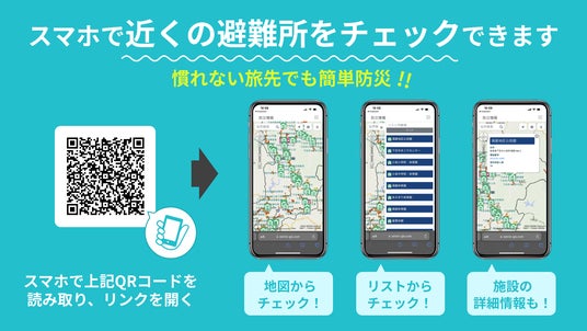 下呂市観光交流センター「湯めぐり館」に75インチのデジタルサイネージ1台を設置。サイネージの画面に表示されているQRコードをスマートフォンで読み取ると周辺の避難所マップや防災マップを閲覧できます。デジタルマップは日本語と英語の表記に対応しており、土砂災害警戒(特別警戒)区域と災害発生時に利用可能な避難所情報を配信します。