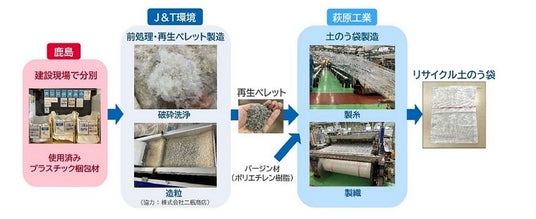 鹿島(社長:天野裕正)は、萩原工業株式会社(社長:浅野和志、以下「萩原工業」)、J&T環境株式会社(社長:長谷場洋之、横浜市鶴見区、JFEエンジニアリンググループ、以下「J&T環境」)と共同で、建設現場で廃棄される使用済みのプラスチック梱包材を、土のう袋の材料として再生利用できることを実証しました。土のう袋のようなフラットヤーン製品(合成樹脂繊維製品)は、一度使用して回収した材料(ポストコンシューマ材料)を用いて再生することが技術的に困難でしたが、本実証では、鹿島の建設現場で分別・回収した使用済みプラスチック梱包材を用いて5万枚の土のう袋を連続的に製造できることを確認しました