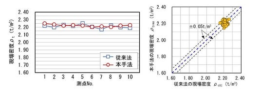 成瀬ダムでは、CSGの締固め品質管理手法として、従来法と併用しながら2022年に本手法を試験導入し、計測精度の向上や牽引方法の改良を重ねてきました。その後、2023年に、同一エリア内で本手法と従来法による試験を実施した結果、その誤差は約±0.05t/m3と僅かであり、本手法により算出した現場密度は従来法による試験と同等の精度を有することを確認しました。