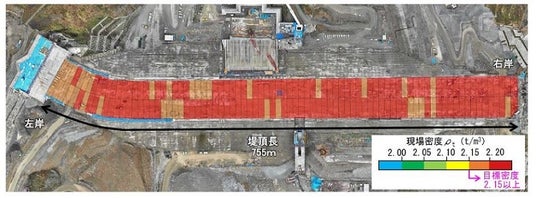 今般、本手法を当社JVが秋田県で施工中の成瀬ダム堤体打設工事(以下、成瀬ダム)におけるCSGの締固め品質管理に導入した結果、従来法による試験と同等の精度を確保しつつ、試験業務に係る人員を約7割削減でき、なおかつ施工面全域にわたる現場密度の可視化を実現しました。