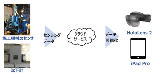 本システムは、施工機械に設置したセンサおよび施工箇所周辺に設置した沈下計から、クラウド経由で施工深度・鉛直変位量の情報を取得し、それらのデータに基づきHoloLens2やiPad Proを用いて施工位置と進捗、沈下計の計測結果をリアルタイムに可視化します(画像1)。