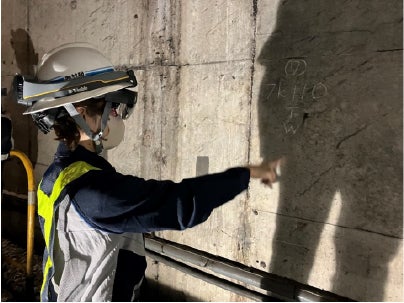 地下鉄営業線に近接して高圧噴射攪拌工法による地盤改良工を行う当社の建設現場において、本システムを試行しました(画像5)。地下鉄トンネル躯体内から地盤改良工の施工位置と進捗をリアルタイムに把握することで、重点的に監視すべき場所を容易に特定することができました。