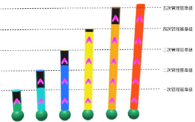 地盤改良工の施工位置は、円柱状の三次元モデルで表示され、施工進捗にあわせて着色部(グレー)が増加します(画像2)。沈下計の計測結果は、沈下計設置場所にシリンダー状の三次元モデルで表示され、計測結果に合わせて高さが変化するとともに、一次から五次のどの管理基準値に相当するかを色分けして表示しています(画像3、4)。