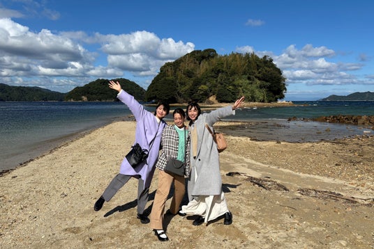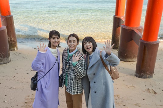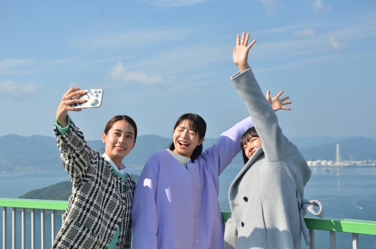 瀬戸内海と大島大橋を見下ろす360°パノラマの絶景「飯の山展望台」、潮が満ちると水に浸かる鳥居が有名な「厳島神社」など、周防大島の「映えスポット」を巡る仲良し3人組。