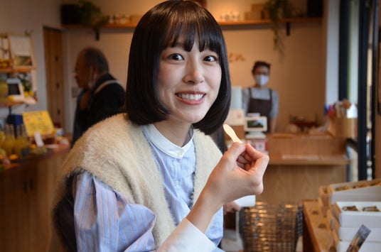 エンジェルロードが現れる海岸のすぐ近くにあるのが、瀬戸内海の海の幸、豊かな自然に育まれた農産物、ジェラート、蜂蜜、地酒などが並ぶ「道の駅 サザンセトとうわ」です。3人はここで島の特産であるみかんの色をした可愛い郵便ポストを発見して大はしゃぎ。おやつには、島で採れた蜂蜜をかけていただく人気スイーツ「はちみつプリン」を堪能します。
