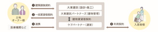 「パートナーガーデン」は、大東建託が設計・施工を手掛け、グループ会社の大東建託パートナーズが建物の管理を、介護・看護・保育・障がい事業を展開するケアパートナーが入居募集および運営を行います。入居者様の身体状況などにより、近隣の医療機関や自治体等と連携を図り、日常生活のサポートや介護保険・医療保険・障がい保険等の各種サービスを提供していきます。