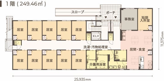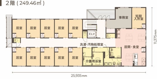 各階に居室10部屋と短期入所室1部屋で計22部屋用意しています。居間・食堂では入居者様が自由に過ごせる空間を提供し、スタッフが作業をしながら見守ることも可能です。利用頻度の高い居間・食堂では、洗面を自動水栓に変更し、車椅子利用者様に配慮した広い浴室を設計するなど、入居者様の利便性を向上させています。