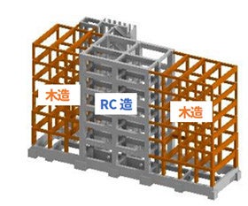 構造・階数:鉄筋コンクリート造+木造・地上6階(中央がRC造・両脇が木造の平面混構造)