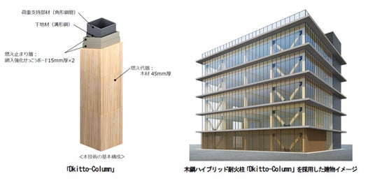 このたび当社は、「Future with Wood」の一環として、事務所など9階建てまでの中高層建築物に採用できる、木材を被覆材に使用した鉄骨部材「Dkitto-Column」を開発しました。「Dkitto-Column」は、耐火被覆に使用する木材の樹種に制限がなく、1.5時間耐火を実現できるとともに、CO2排出量削減に貢献できます。