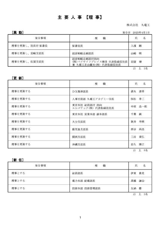 株式会社九電工は、下記のとおり主要人事について決議しましたので、お知らせいたします。