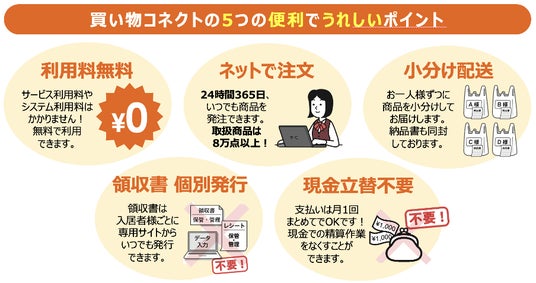 買い物コネクトは、介護施設・福祉施設における買い物代行業務を効率化するための業務支援サービスです。施設スタッフの皆様がネットからいつでも簡単に注文することができ、注文した商品は入居者様ごとに小分けしてお届けされ、また、領収証も個別発行できる等、介護施設・福祉施設による利用に特化した便利な機能が備わっています。