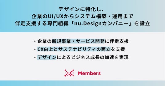 DX現場支援で顧客と共に社会変革をリードする株式会社メンバーズ(本社:東京都中央区、代表取締役社長:高野 明彦、東証プライム:2130、以下「メンバーズ」)は、サービス・プロダクトデザイン支援に特化し、企業のビジネスの企画・開発・グロースフェーズにおいて、UI/UXデザインからデザインシステムの構築、運用改善までを伴走型で支援する専門組織「nu.Designカンパニー(ヌウデザインカンパニー)」を2025年4月1日付で設立したことをお知らせします。