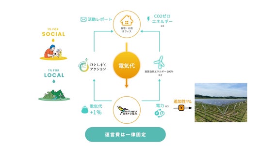 月々の電気代の1%を社会をよくするために活動する人や団体への支援に寄付、もう1%が再生可能エネルギー発電所の増設につながるという仕組みのこと。