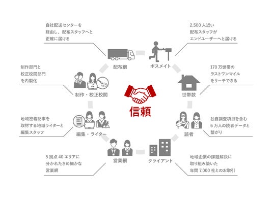 当社は、地域密着型の生活情報誌『ちいき新聞』の発行を軸に、情報発信および販売促進の総合支援事業を展開しており、年間約7,000社にサービスを提供しています。千葉県を中心に毎週発行している『ちいき新聞』は、専属の配布員により170万世帯へポスティングされ、創業以来40年以上にわたり配布を継続してきたことで、他に類を見ない9つのアセットを築いてきました。