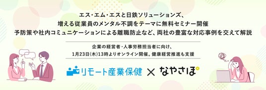 株式会社エス・エム・エス(本社:東京都港区、代表取締役社長:後藤夏樹、東証プライム、以下「当社」)と、日鉄ソリューションズ株式会社(本社:東京都港区、代表取締役社長:玉置和彦、東証プライム、以下「NSSOL」)は、経営者・人事労務担当者向けの無料オンラインセミナーを1月23日(木)に開催することをお知らせします。