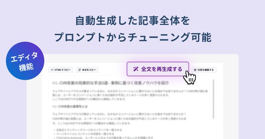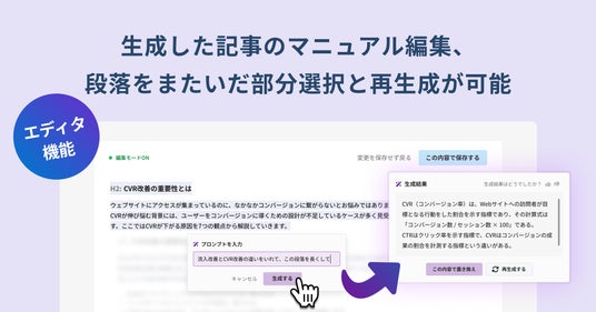 本機能は、単にAIが文章を生成するのではなく、ネット上の最新情報を活用し、検索ユーザーが求めるテーマを適切に反映した記事を作成できるのが特長です。また、自社メディアの特性を学習し、ターゲットに最適なコンテンツを生成できる独自モデルを組み合わせることで、企業の専門分野や読者のニーズに合った高品質な記事を簡単に作成できます。