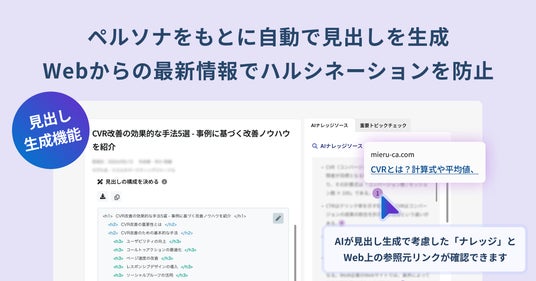本機能は、2024年 5月にリリースした、自社メディアの特徴を学習した WEBコンテンツの見出しを自動生成するアルゴリズムと組み合わせています。(本機能の詳細はこちら: https://mieru-ca.com/blog/private-ai-content-assist/)。