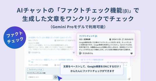 さらに、生成した記事の内容をネット上の情報と照らし合わせてチェックする「ファクトチェック機能(β版)」も提供し、記事の正確性をより高めることが可能です。