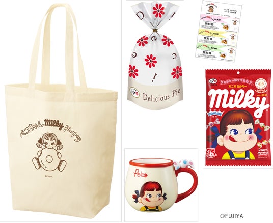 「ペコちゃんmilkyドーナツ」ロゴが入ったオリジナルのトートバッグに、「デリシャスパイ」や不二家のお菓子、グッズを詰め合わせました。お得なドーナツクーポン付きです。