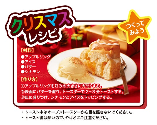 ふわふわのパンとシャキシャキのりんご、甘いシュガーアイシングのトッピングが素朴でやさしいおいしさの菓子パンです。発売当初から変わらない大きなサイズ、ちぎって食べやすい形は、家族や仲間と分けあって食べるのに最適。楽しいクリスマスパーティーにもおすすめの商品です。
