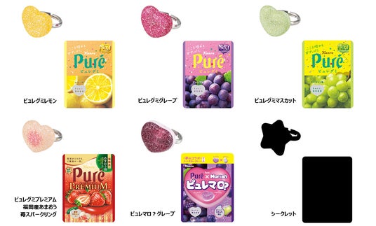 今回は、第1弾・第2弾のパッケージ違いとして再登場のピュレグミレモン、グレープ、マスカットに加えて、季節限定商品の「ピュレグミプレミアム福岡産あまおう苺スパークリング」のほか、「ピュレグミ」とカンロの新定番「マロッシュ」がコラボレーションした「ピュレマロ?グレープ」の2種類が新たに仲間入り。さらに、シークレット1種を加えた全6種のバリエーションです。ピュレグミの特徴であるハート型のグミ粒やカラフルなパッケージを再現した、全種類集めたくなるようなかわいらしい仕上がりです。