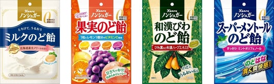 1992年の発売以来、長年多くのお客様にご愛顧いただいている「ノンシュガーのど飴シリーズ」は、4種のフルーツのジューシーなおいしさが楽しめる「ノンシュガー果実のど飴」、のどや鼻をすっきりさせたい時におすすめな「ノンシュガースーパーメントールのど飴」、後味のスッキリしたコクのあるミルクの味わいが楽しめる「ノンシュガーミルクのど飴」、厳選した和漢ハーブエキスを使用した優しく、うるおい巡る「ノンシュガー和漢びわのど飴」などシーンに合わせた多様な商品をご用意しております。