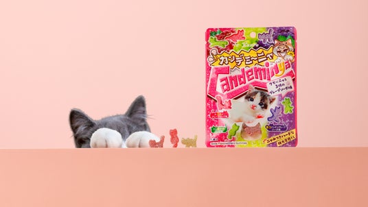 グミ型は、威嚇したり寝転んだり、立ち上がったりと、目にも楽しい7(ニャニャ)種の猫型を採用しています。さらに、出会えたらラッキーなレア型としてこれまで展開していた「肉球型」のほか、カンデミーナシリーズならではの立体造形を活かした「ネコ顔型」が新たに加わりました。フレーバーは猫にちなんだネーミングで、「エニャジーグレープソーダ味」「マスキャットソーダ味」「ネコパンチングレープソーダ味」の“クセにニャる”3種のグレープソーダ味です。