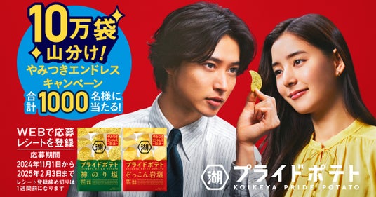 株式会社湖池屋(社長:佐藤章)は、独自の“やみつきエンドレス製法”が引き立てる国産芋の旨みと神業食感で人気の「湖池屋プライドポテト」ブランドにて、購入レシートでポイントをためて応募すると、合計1000名様に商品の詰め合わせ等が当たる「湖池屋プライドポテト10万袋山分け やみつきエンドレスキャンペーン」を実施します。