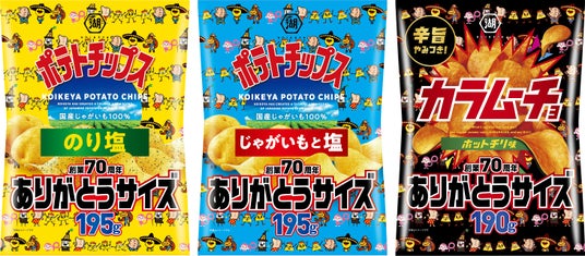 株式会社湖池屋(社長:佐藤章)は、創業70周年を記念した大袋商品「創業70周年ありがとうサイズ ポテトチップス のり塩」「創業70周年ありがとうサイズ ポテトチップス じゃがいもと塩」「創業70周年ありがとうサイズ カラムーチョチップス ホットチリ味」を2024年11月4日(月)に全国・全チャネルで発売しました。