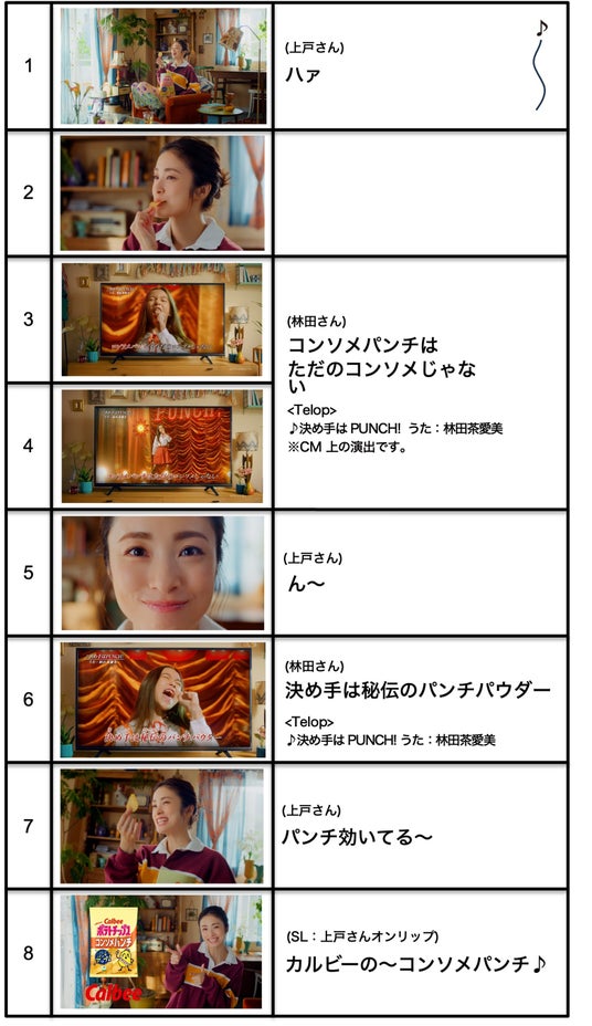 今回のCMでは「ポテトチップス コンソメパンチ」のイメージキャラクターにカルビー2作目の出演となる上戸彩さんを起用し、「コンソメパンチはただのコンソメじゃない」をコンセプトに、思わず食べたくなるようなパンチとエッジの効いた、楽しいCMを制作しました。パンチの効いた歌をかけ合わせた演出に、チャーミングなリアクションを見せる上戸さんのお芝居や表情で、「ポテトチップス コンソメパンチ」のおいしさをしっかりと表現しています。また、見た目とは裏腹にエッジの効いた歌声で一躍有名になった林田茶愛美さんとの初共演にもぜひご注目ください。