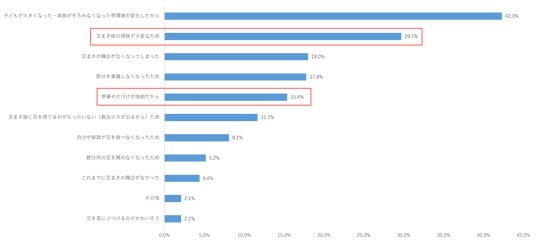 Q: 豆まきをしなくなった、または、豆まきをしたことがない理由を教えてください