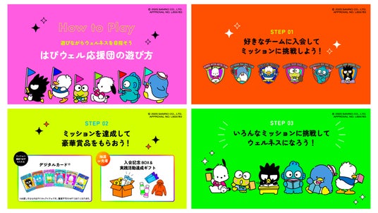 「はぴだんぶい」の6キャラクターが応援団長、参加企業が応援団員(応援団企業)、ユーザーが選手となって、さまざまなミッションに挑戦しながらウェルネスをめざします。6つのチームから好きなチームに入会して複数企業の気軽なミッション達成を目指す「チーム入会編」と、企業別の本格的なミッションに挑戦する「実践活動編」の2種類のコースに参加できます。