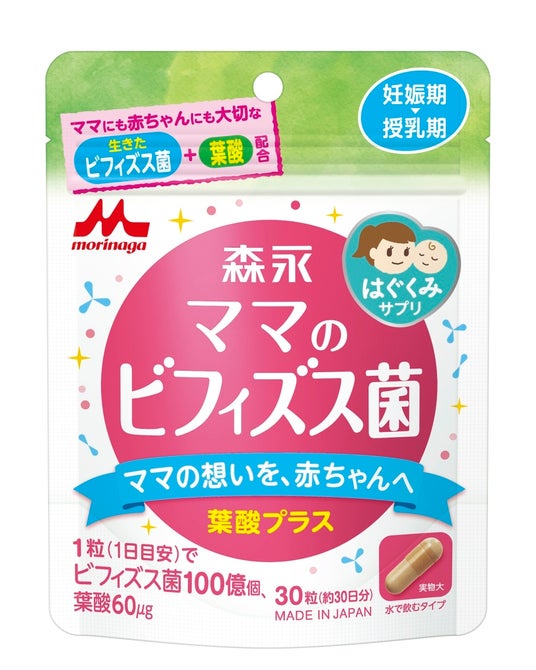 このたび新発売する「森永はぐくみサプリ ママのビフィズス菌」は、妊娠・授乳期のママにも赤ちゃんにも大切な、生きたビフィズス菌BB536を100億個と葉酸60ugをカプセル1粒に配合したサプリメントです。ビフィズス菌を生きたまま腸まで届けられるように工夫したカプセル化技術を採用しており、より効率的にビフィズス菌を摂取することができます。