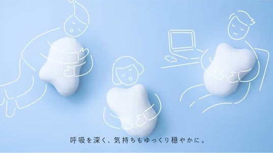 抱きかかえて使う呼吸誘導型のロボットクッションです。クッションがゆったりとした呼吸の動きを再現し、抱きかかえるだけで自然と心が落ち着く感覚を得ることができます。