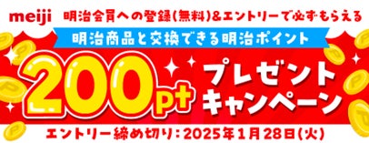 株式会社 明治(代表取締役社長:松田 克也)は、DXマーケティングの推進とともに、お客さまへの継続的な健康価値の提供を図るため、当社独自のポイントサービス「明治ポイント」の本格運用を、2025年1月より開始します。本格運用開始を記念して、本日より、明治会員IDに登録し、エントリーするだけで200ポイントがもらえる「明治会員ID新規登録キャンペーン」を実施します。