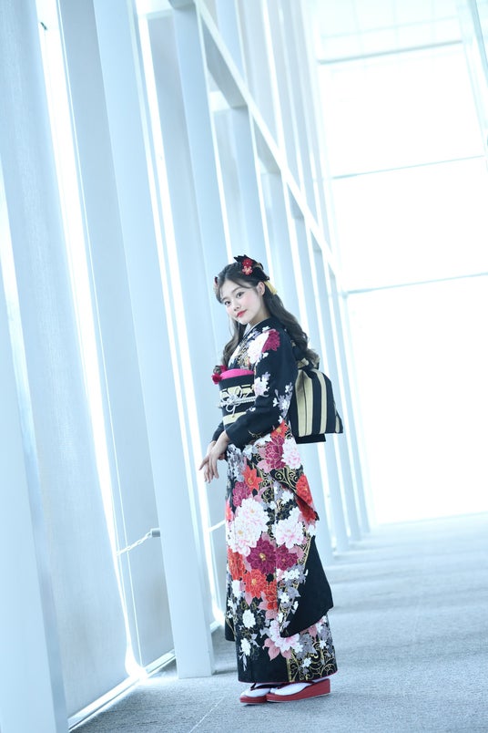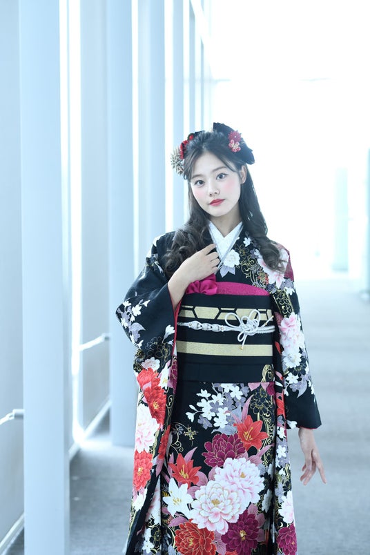 牡丹の花は、幸福や豊かさの象徴とされ人気があり、周りに菊や桜・ユリなどの花を添えることで華やかさをプラス。黒地に赤が目を引く1着。