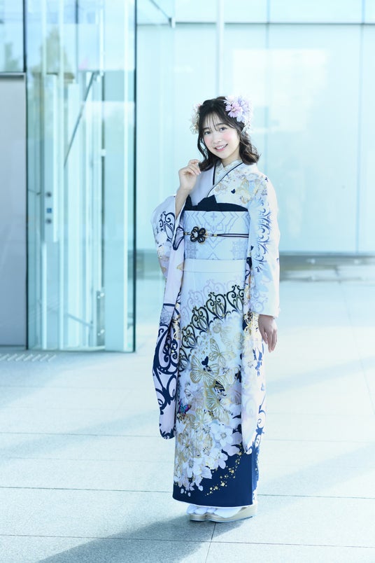蝶の描き方も3通りを組み合わせ、奥行きのある柄に。グレーとピンクで色分けされた地色に裾の紺色がスッキリと見える振袖です。