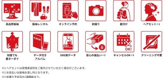 約1500種類の正絹を中心とした高品質な振袖から選択、お気に入りの1着をそのままオンラインで予約でき、振袖には帯一式はもちろん、着付けに必要な小物10点もすべてご用意。前撮り時の着付け・ヘアセット、撮影データはもちろん、10ページ12カットの本格的なアルバムもついた、成人式のお祝いをすべて安心してお任せいただける充実の内容になっています。