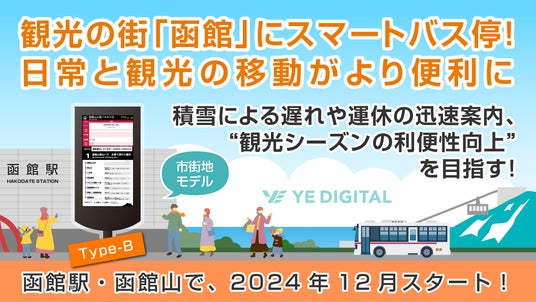 株式会社YE DIGITALが提供し、西鉄エム・テック株式会社(※1)が販売する「スマートバス停」が、この度、函館バス株式会社(本社:北海道函館市、代表取締役社長:森 健二、以下 函館バス)が運営管理する函館駅前4番のりばバス停と函館山バス停に導入され、2024年12月より運用を開始いたします。
