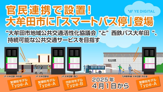株式会社YE DIGITAL(本社:北九州市小倉北区、代表取締役社長:玉井裕治、以下YEデジタル)が提供し、西鉄エム・テック株式会社(本社:福岡市中央区、代表取締役社長:丹山裕和)が販売する「スマートバス停」を、大牟田市地域公共交通活性化協議会(事務局:大牟田市国県道路・地域交通対策課)と西鉄バス大牟田株式会社(本社:福岡県大牟田市、代表取締役社長:大石一紀、以下 西鉄バス大牟田)が官民連携で導入し、2025年4月1日から運用を開始します。